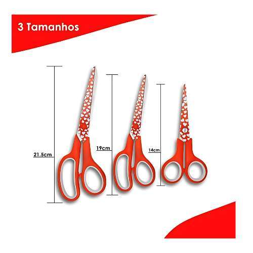 • Conjunto: 3 tesouras com tamanhos distintos — aproximadamente 14 cm, 19 cm e 21,5 cm.
